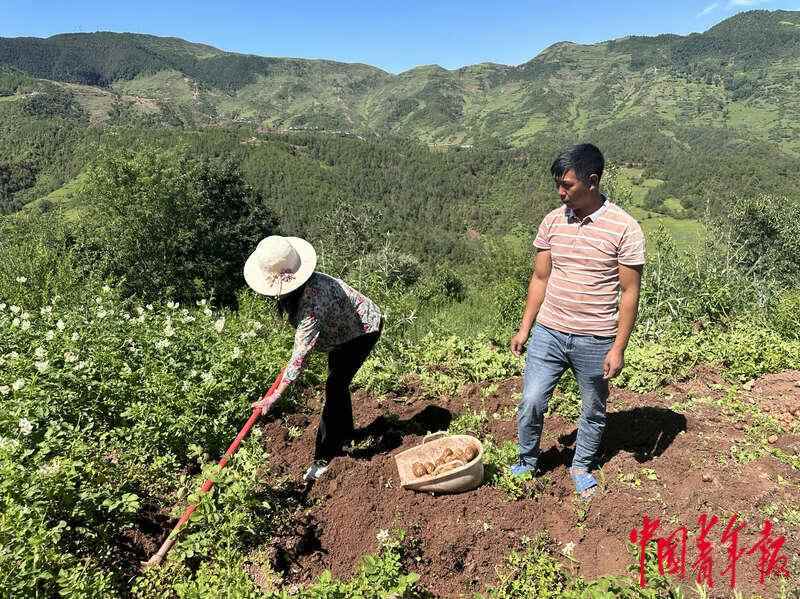 7月22日,吉好也求和妻子马海子呷在位于三河村旧址的田地里收土豆。中青报·中青网见习记者 王雪儿/摄