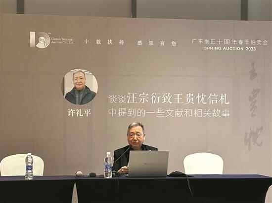 拍卖举槌前夕,著名学者、出版人许礼平在预展现场开讲《谈谈汪宗衍致王贵忱信札中提到的一些文献和相关故事》。许礼平谙熟省港学人故事,与汪宗衍、王贵忱二老均有往还,他对这批信札的解读,将听众们拉进了一个翰墨飘香的往日时代。