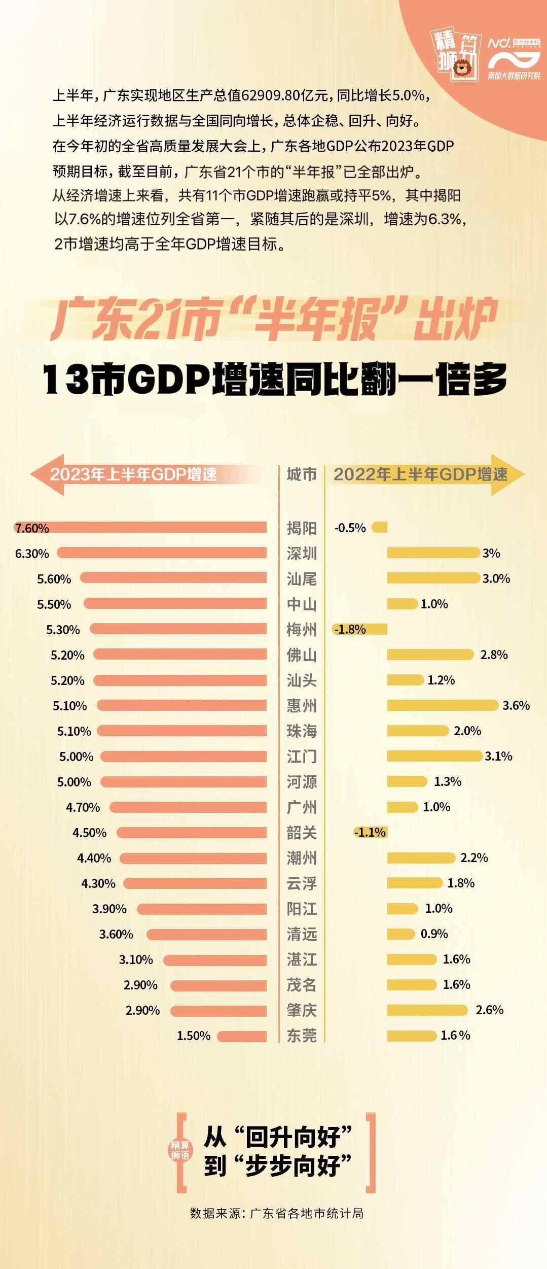 回望2022年广东2%的GDP增幅,今年上半年5%的增速进一步凸显了经济增长的全面恢复。对比发现,除东莞外,有20个市上半年GDP增速超去年同期增长水平,13市同比翻1至2倍或以上,揭阳、梅州、韶关增长势头最快。