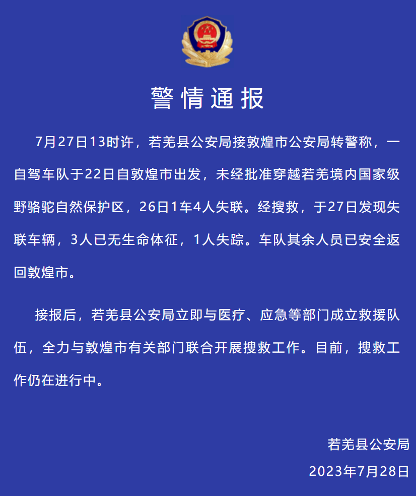 7月27日13时许,若羌县公安局接敦煌市公安局转警称,一自驾车队于22日自敦煌市出发,未经批准穿越若羌境内国家级野骆驼自然保护区,26日1车4人失联。经搜救,于27日发现失联车辆,3人已无生命体征,1人失踪。车队其余人员已安全返回敦煌市。