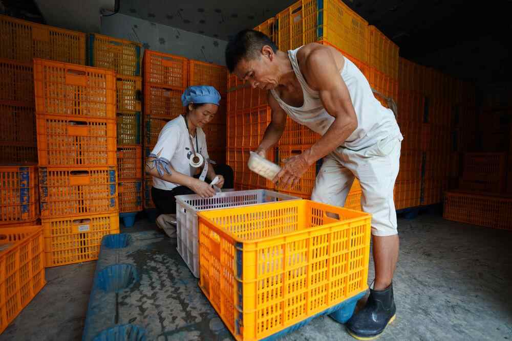 7月27日,两名工人在刘禹丹的豆腐加工厂内工作。新华社记者 陈欣波 摄