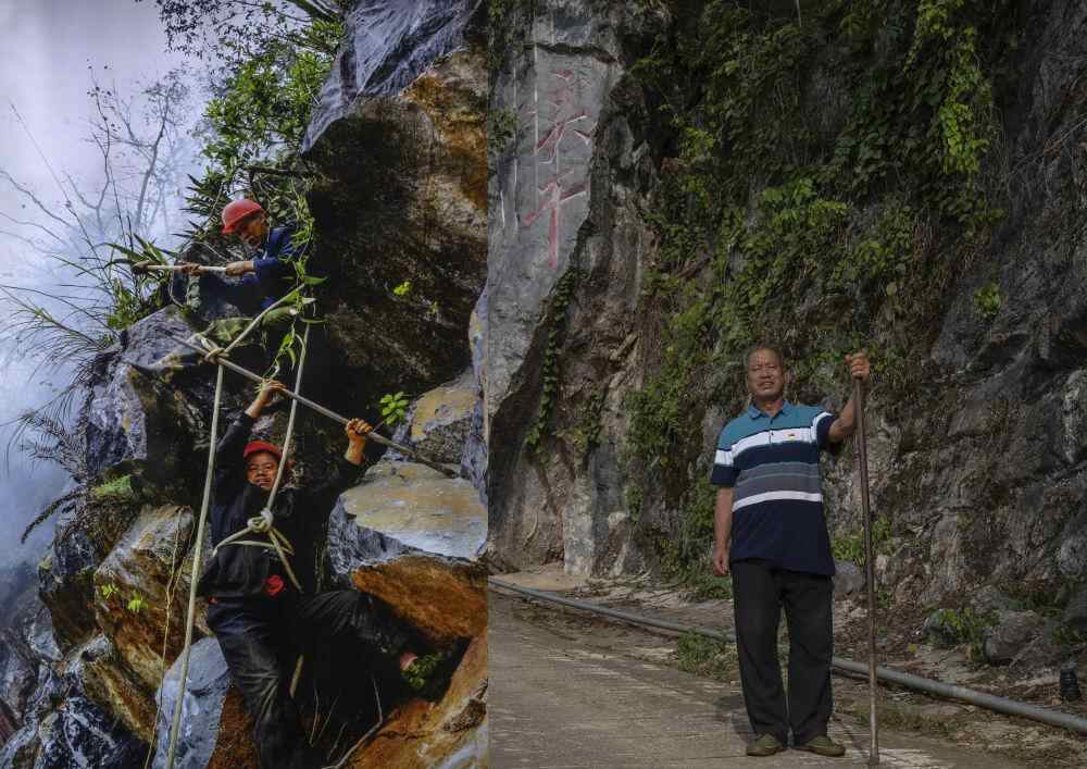 拼版照片:左图为2008年李华明(下)和同伴在修路时在悬崖上打炮眼的资料照片(西畴县融媒体中心供图);右图为2023年7月26日李华明在修好的出村路上留影(新华社记者 费茂华 摄)。