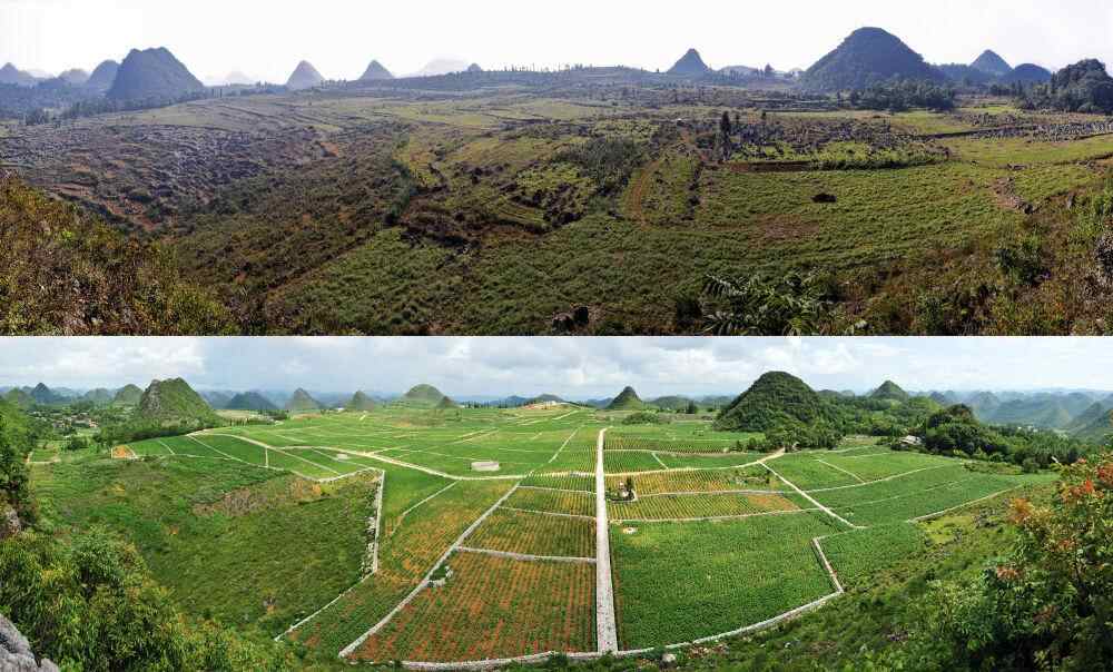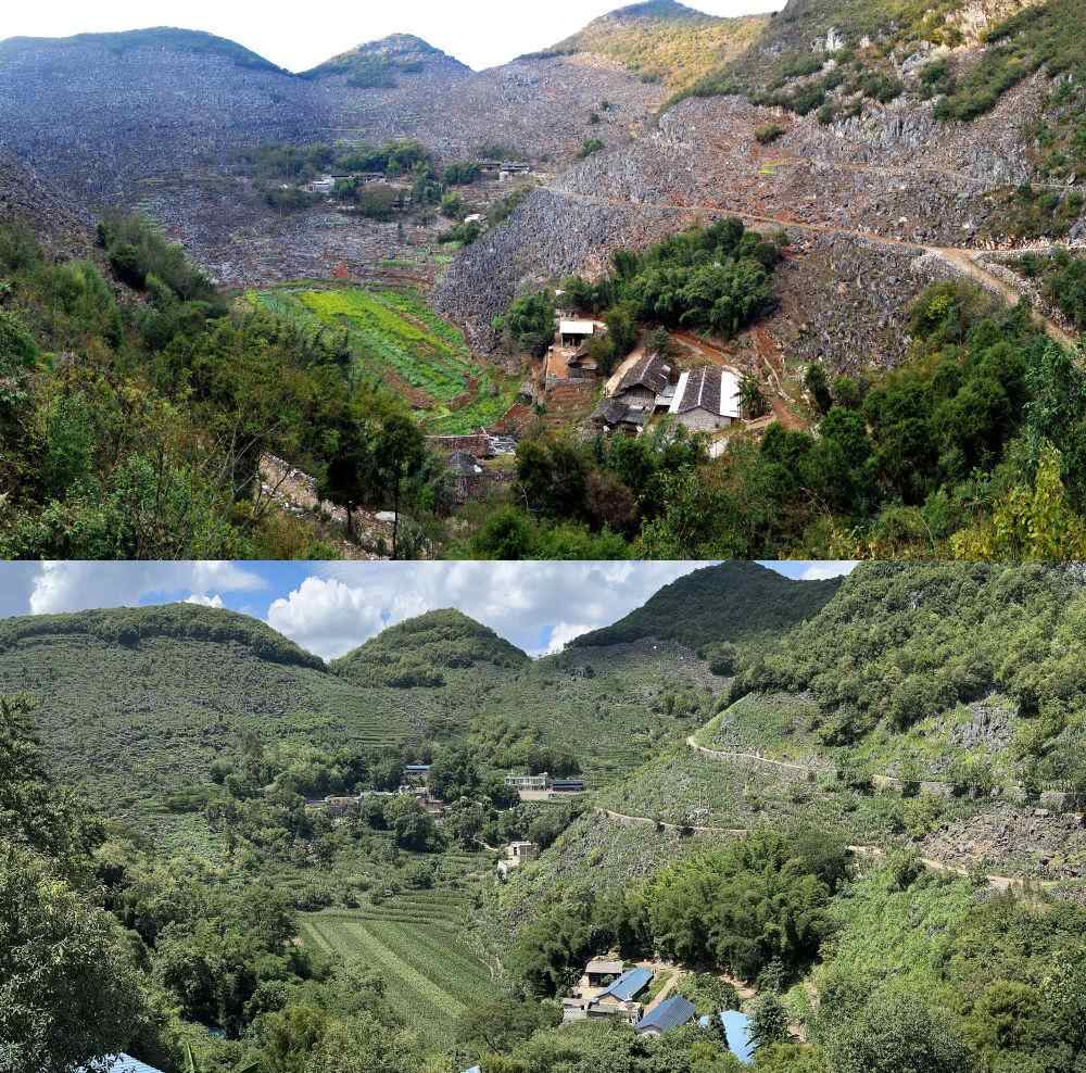 拼版照片:上图为1991年拍摄的西畴县大邬麻村改造前的石漠化情况(西畴县融媒体中心供图);下图为2023年7月26日拍摄的西畴县大邬麻村改造后的情况(新华社记者 费茂华 摄)。