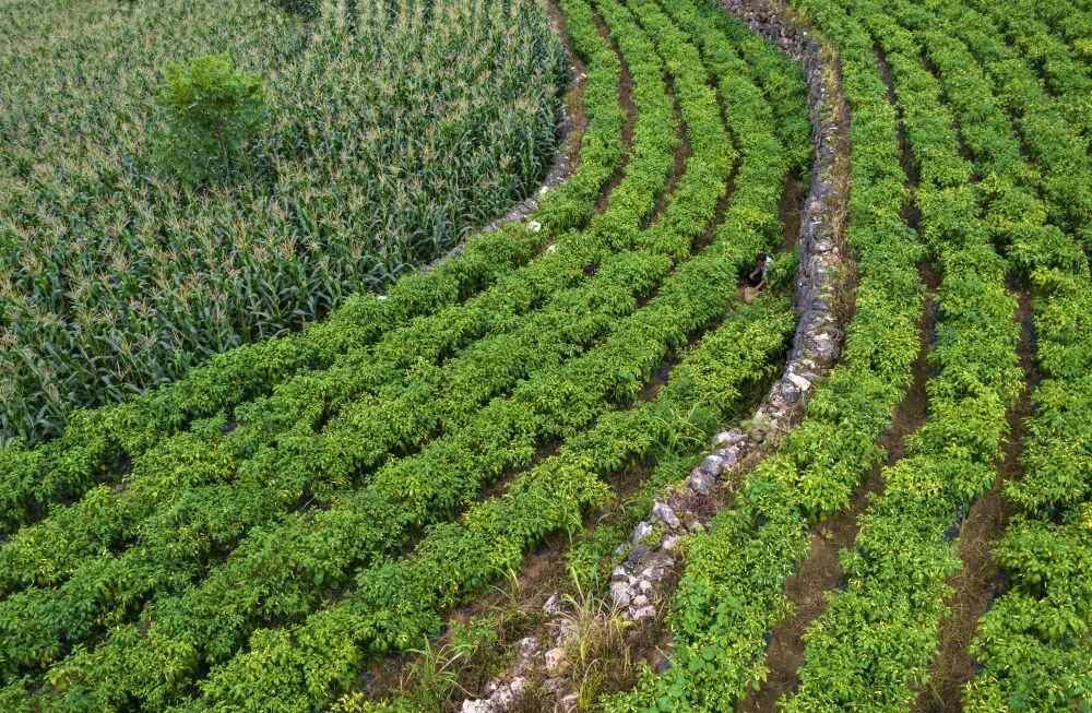 7月27日,一位村民在木者村“摸石谷”中建成的“三保”台地上干农活。新华社记者 杨植森 摄