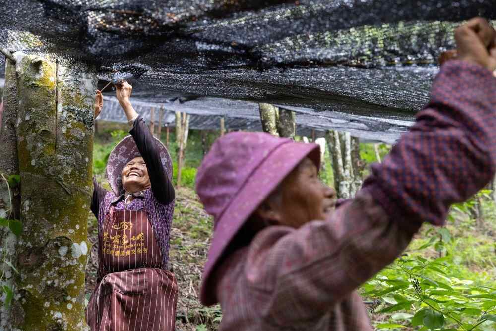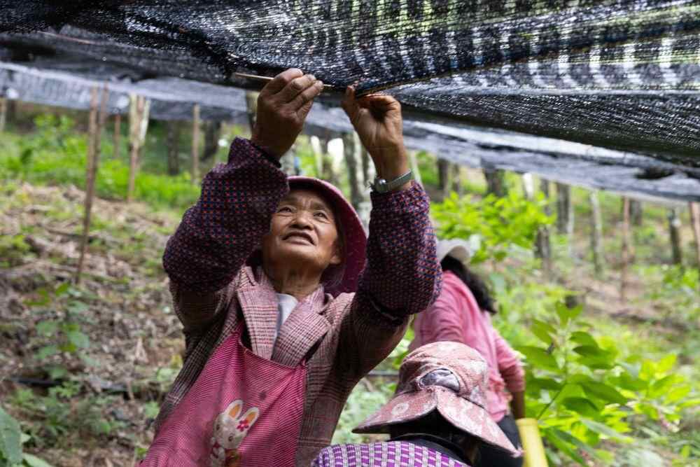 7月27日,工作人员在云南西畴县西洒镇的中药材基地修补遮阳网。新华社记者 吕帅 摄