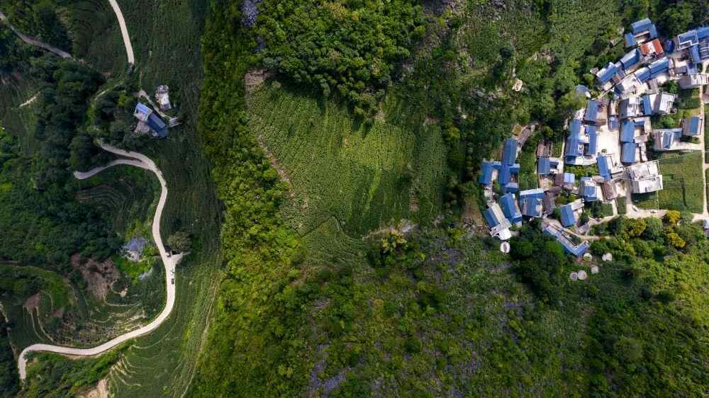 这是7月26日拍摄的西畴县山间公路,右侧这条是岩头村村民小组长李华明带领群众修建的最后一公里进村道路。新华社记者 陈欣波 摄