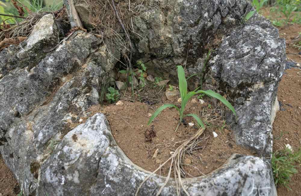 图为2023年7月27日拍摄的一棵种在石头凹里的玉米,西畴县原来的土地大部分都是这样的。新华社记者 费茂华 摄
