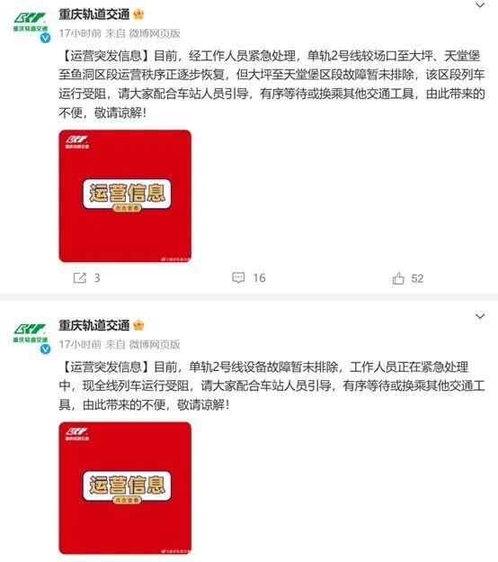 此次事故影响了2号线的运营。29日晚9时许,重庆轨道交通官方微博发布运营突发消息称,2号线因设备故障,造成全线列车运营有所延误。
