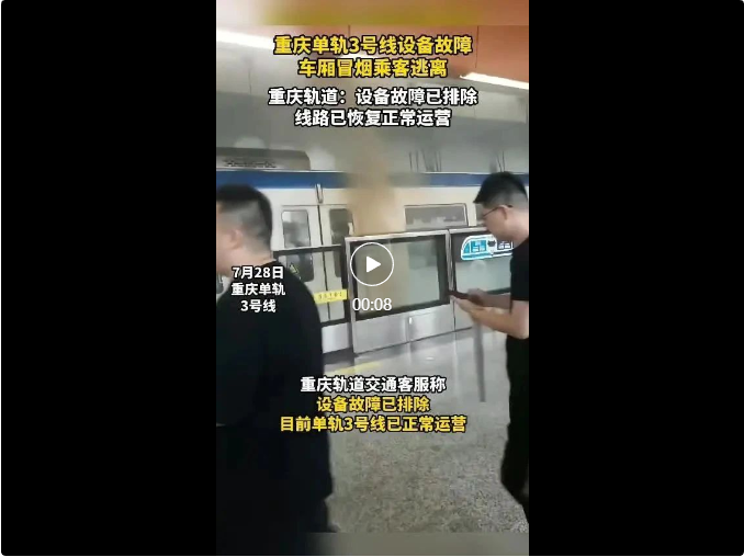 在28日的故障现场,列车在车站内冒出白烟,乘客低头快步撤离。重庆轨交集团运营管理中心事后在官网致歉,称将进一步提高轨道交通系统设备的维护保养和应急抢险能力,尽量减少突发事件的发生。