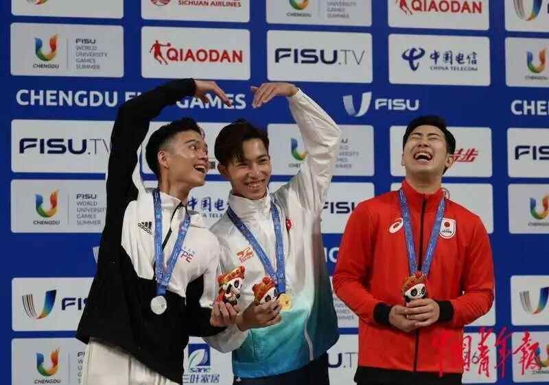 △7月29日,成都大运会武术比赛男子太极剑项目颁奖仪式上,中国香港选手许得恩(中)与中国台北选手孙家闳(左)“比心”。在成都大运会首个比赛日,他们分别获得这个项目的金牌和银牌,日本选手EBINA Tohma(右)获得铜牌。 (图片来源:中国青年报)