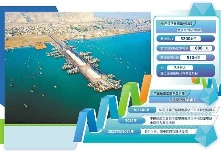 当前正处于中巴经济走廊建设的第二阶段,这也是至关重要的高质量发展新阶段。中巴双方在走廊框架下,进一步加强巴国工业化进程、人力资源培训和产业园区建设,在扶贫、医疗、农业以及互联网等众多与民生息息相关的领域持续深化合作,力求创造更多就业机会,不断推动巴基斯坦的经济和社会现代化发展,造福当地民众。2022年6月,中国援助巴基斯坦瓜达尔东湾快速路通车,打通了瓜达尔港和卡拉奇之间的交通运输通道。同年,中巴经济走廊首个水电投资项目——卡洛特水电站全面投入商业运营,每年将向巴基斯坦提供32亿千瓦时廉价清洁电能,满足当地500万人用电需求,每年可节约标准煤约140万吨,减少二氧化碳排放350万吨。今明两年,走廊框架下的多个水电、风电项目将陆续投运,未来巴基斯坦在清洁能源领域大有可为。