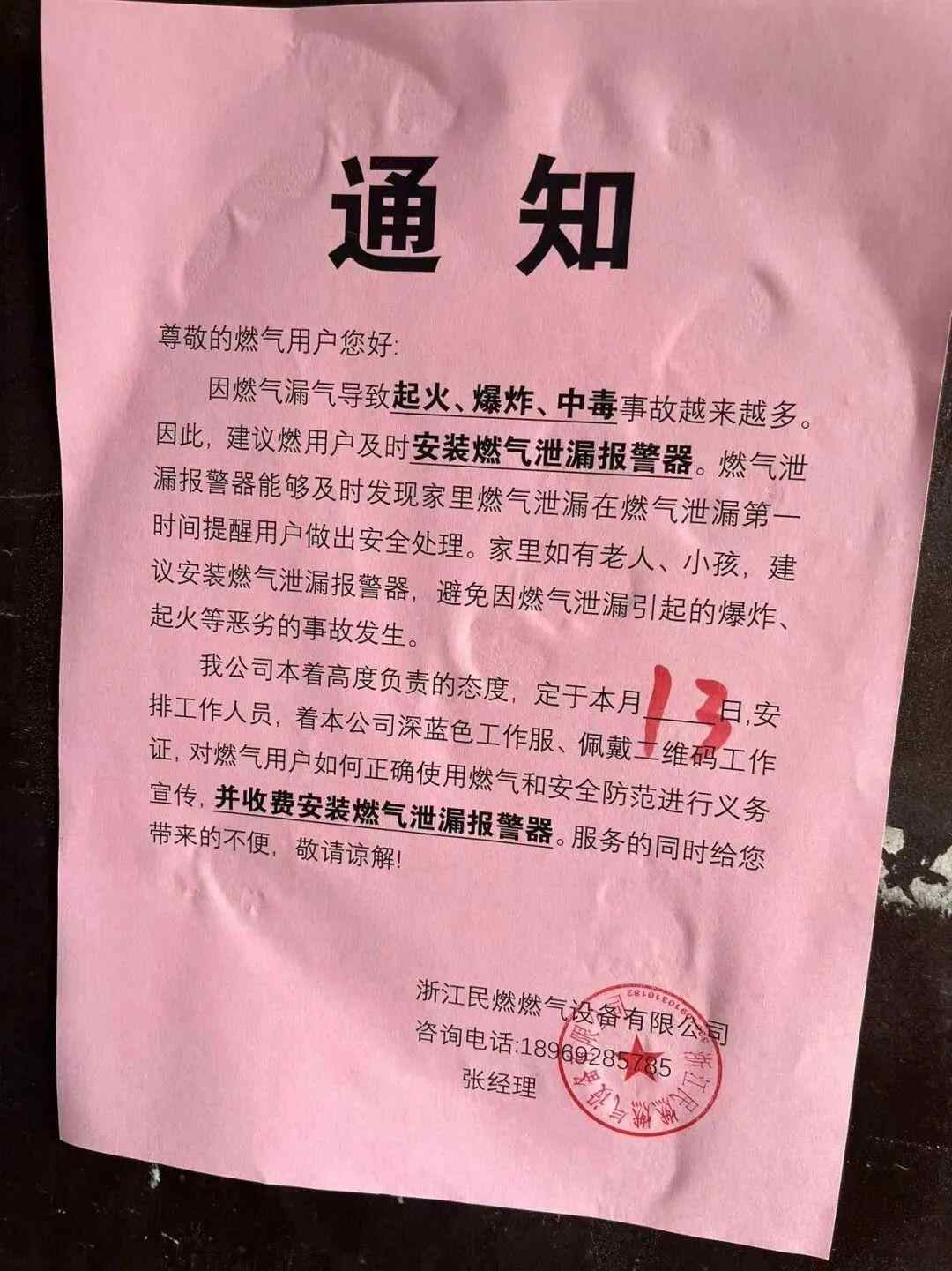7月13日,绍兴诸暨市天然气有限公司接到暨阳街道蠡湖新村吴阿姨来电,反映有人以燃气公司排查安全隐患为由,要求用户安装燃气泄漏报警器,并现场收取高额费用。