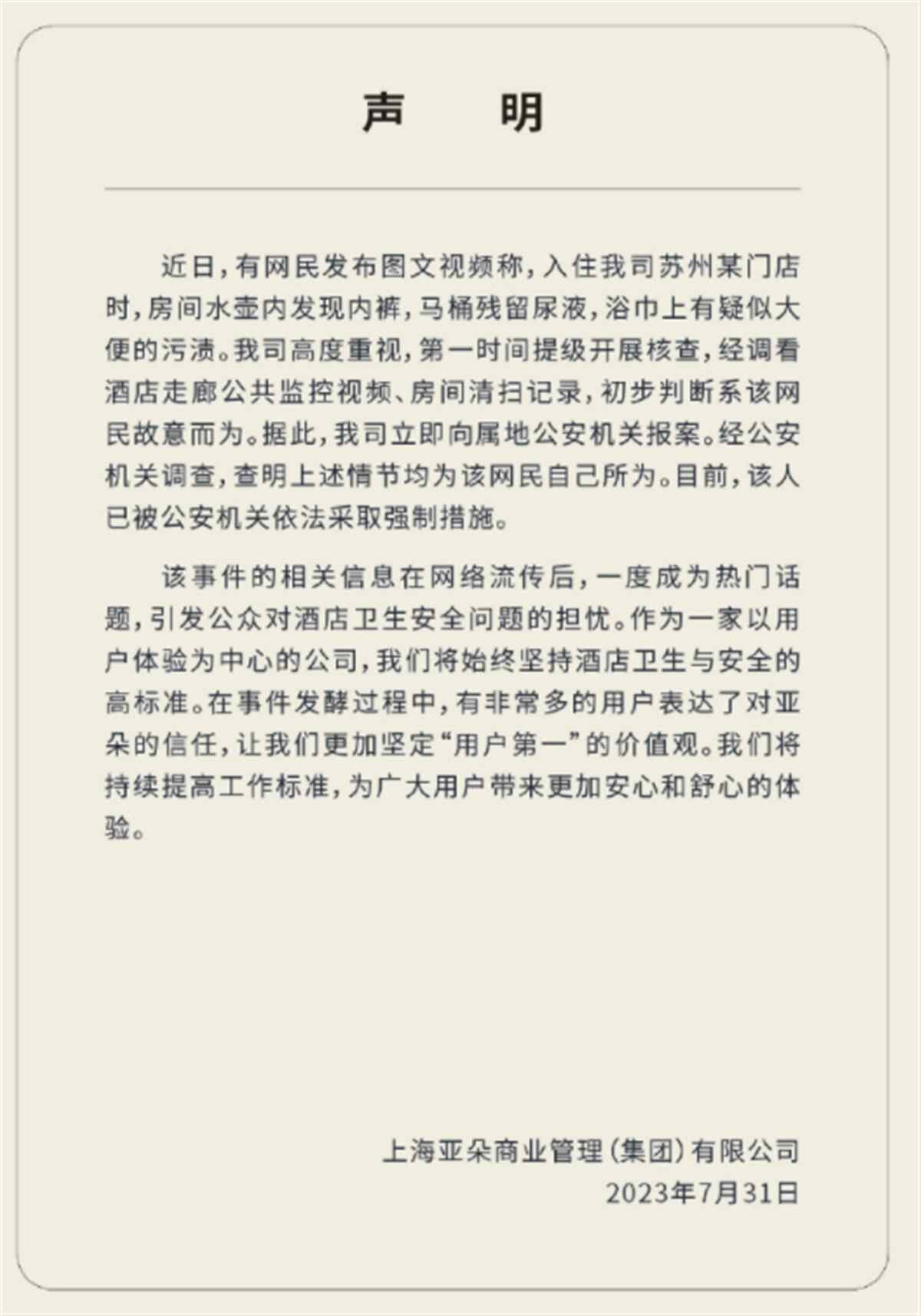 7月31日,上海亚朵商业管理(集团)有限公司就此事发表声明称是网民恶意投诉,该人已被公安机关依法采取强制措施。