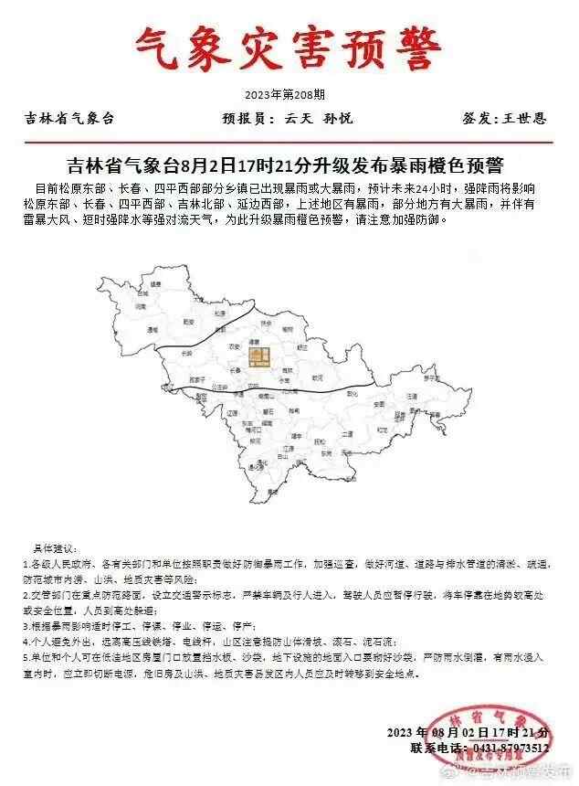 吉林省气象台8月2日17时21分升级发布暴雨橙色预警:松原东部、长春、四平西部部分乡镇已出现暴雨或大暴雨,预计未来24小时,强降雨将影响松原东部、长春、四平西部、吉林北部、延边西部,上述地区有暴雨,部分地方有大暴雨,并伴有雷暴大风、短时强降水等强对流天气,为此升级暴雨橙色预警。