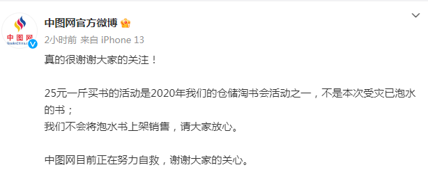对此,中图网官方微博回复称:“ 25元一斤买书的活动是2020年我们的仓储淘书会活动之一,不是本次受灾已泡水的书;我们不会将泡水书上架销售,请大家放心。中图网目前正在努力自救,谢谢大家的关心。”