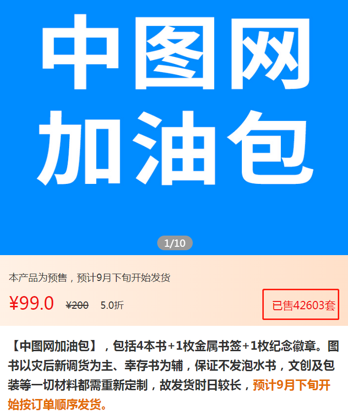 赵女士称,书友得知中图网被淹后,很多人都想给中图网捐款,“我们肯定不能接受捐款的,但是又的确需要一定的帮忙,所以我们上线了一款‘加油包’,里面包含4本书和2个文创产品,目前已销售4万多个,可能要到9月下旬才能发货,希望大家谅解,也期待能让大家满意。”