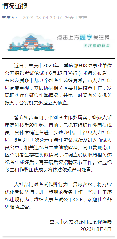 据重庆人社消息,近日,重庆市2023年二季度部分区县事业单位公开招聘考试笔试(6月17日举行)成绩公布后,有网友质疑丰都县个别考生成绩异常。市人力社保局高度重视,立即协同相关区县开展核查工作,发现确实存在疑似作弊情况,并第一时间向公安机关报案,公安机关迅速立案侦查。