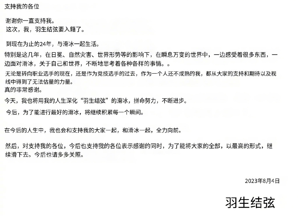 在文中他这样写道:“感谢大家一直以来对我的支持。这次,我,羽生结弦要入籍结婚了。