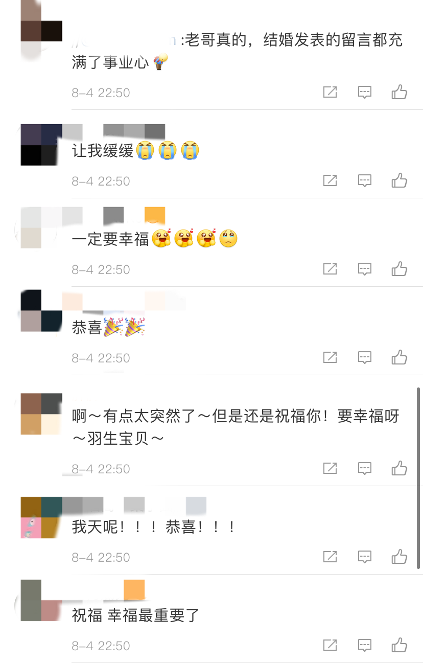 中国的羽生结弦拥趸们纷纷表示:“祝福!但让我先缓一缓”“怎么一点征兆都没有”“相信婚姻可以像花滑一样让他感到幸福!”“太好了,花滑事业进入下一阶段,人生也要进入下一阶段了,加油”。