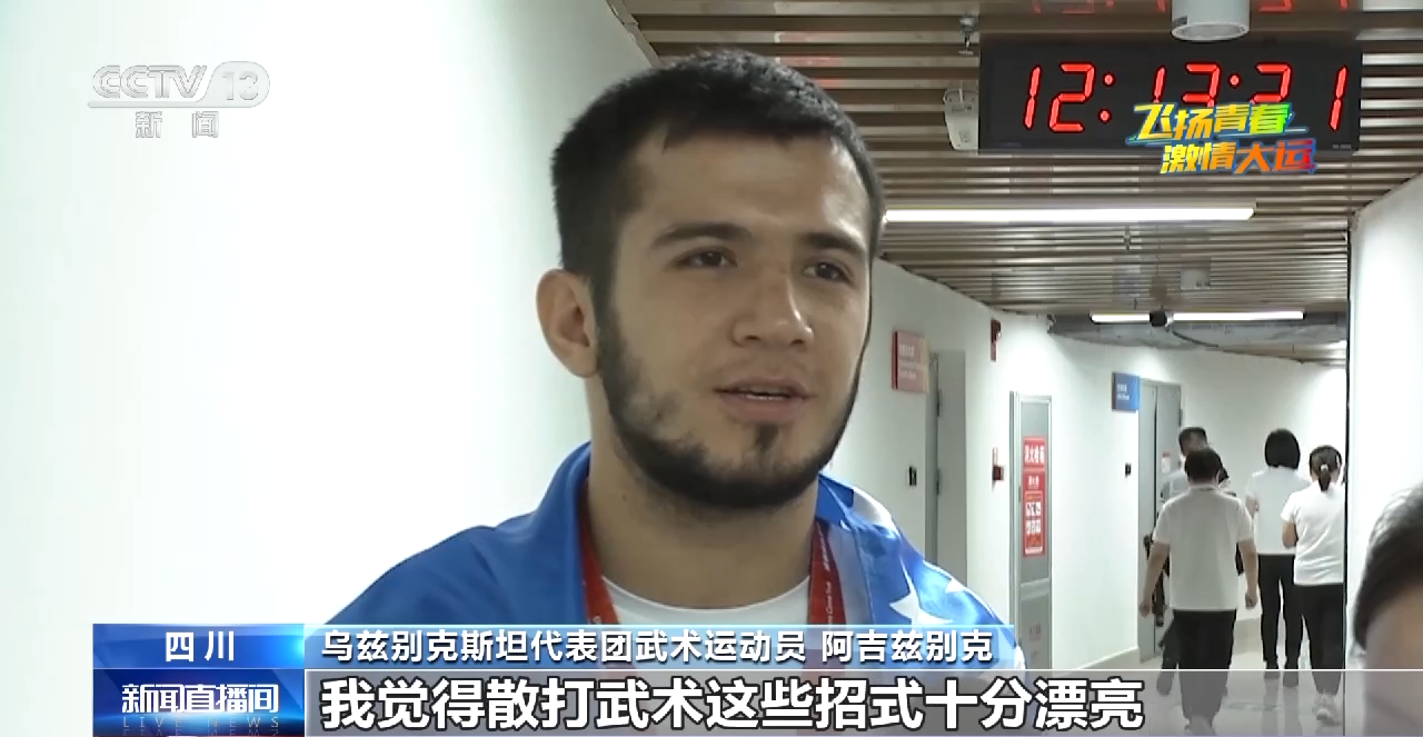 乌兹别克斯坦代表团武术运动员 阿吉兹别克:我从小大概七岁就接触武术,我觉得散打武术这些招式十分漂亮,我非常喜欢,在我们国家也有很多人在练习武术。