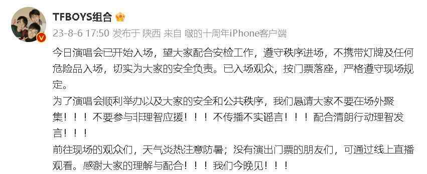 刚刚,组合官博及@TFBOYS-王俊凯 @TFBOYS-王源 @TFBOYS-易烊千玺 发文呼吁大家配合安检工作,遵守秩序进场,不携带灯牌及任何危险品入场,遵守现场规定;恳请大家不要在场外聚集,不要参与非理智应援,不传播不实谣言。