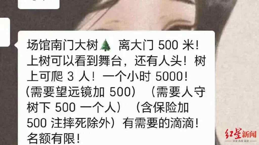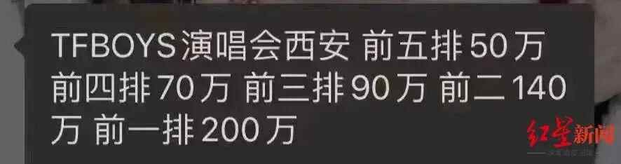 一张广为流传的图片显示,第一排的门票已被“黄牛”标价至20万元一张,第二、第三排也要15万元一张。另一份聊天记录显示,演唱会前五排单张门票的价格已被炒至50万元,一张第一排门票的价格为200万元。更为夸张的是,有消息称,有人占据了演唱会场馆外可以看到舞台的大树,以每小时5000元向粉丝出租爬树看演唱会的位置。尽管真假难辨,但足见这场演唱会的火爆程度。