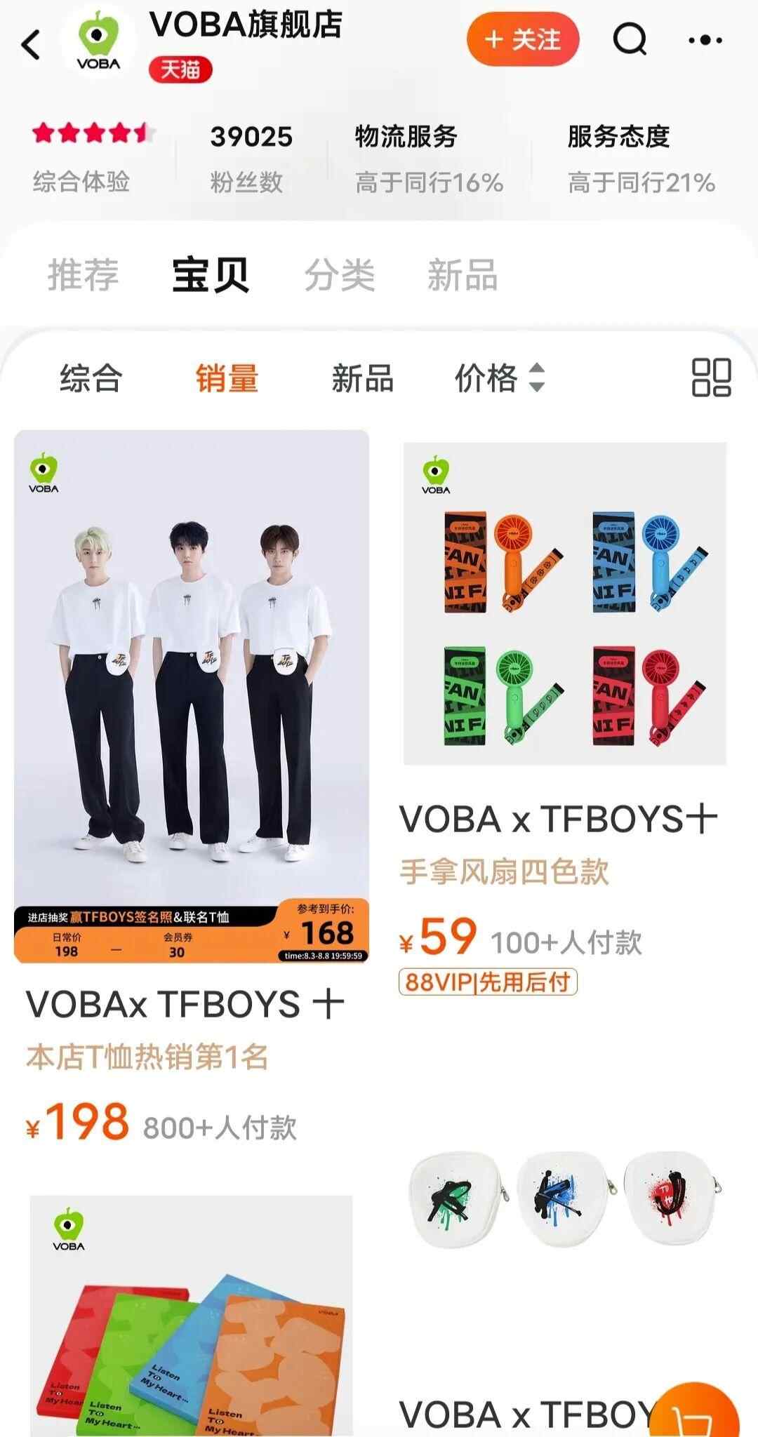 值得一提的是,此次TFBOYS十年周年纪念活动还引入了合作伙伴VOBA。其天猫旗舰店显示,该品牌的大多数物品都和TFBOYS十周年纪念活动有关,包含应援服、运动鞋、短裤、纪念T恤小包套装、丝巾、鸭舌帽、小风扇、便签纸等,价格从29.9-558元不等。目前,店内卖得最好的还属TFBOYS的应援服——一件售价198元的短袖,月销量显示在900+,该品类一个月的收入就近20万元。