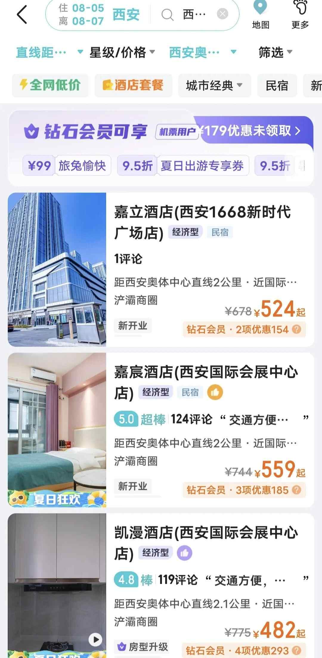 记者查询相关平台发现,距演出地西安奥体中心约两三公里的普通连锁酒店,价格在每晚四五百左右,平常则仅需一两百。