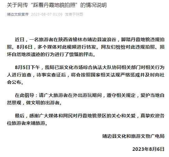 8月7日,陕西省榆林市靖边县文化和旅游文物广电局发布《关于网传“踩着丹霞地貌拍照”的情况说明》,表示已派文化市场综合执法大队协同相关部门对相关行为人进行追查,待事实查证后,将会按照国家相关法规严格惩戒并及时向社会公布。详情如下: