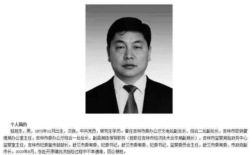 据“吉林市发布”微信公众号消息,舒兰市委常委、常务副市长骆旭东等3名公职人员在抢险救灾中因公牺牲。
