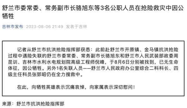据舒兰市抗洪抢险指挥部:此前赴舒兰市开原镇、金马镇抗洪抢险过程中遇险失联的舒兰市委常委、常务副市长骆旭东和舒兰市人民武装部政委周昆训、吉林市水利水电规划院高级工程师倪峰,于8月6日分别被找到,已无生命体征,因公牺牲。另外1名失联人员——舒兰市人民政府办公室综合二科科长、四级主任科员张郅昭仍在全力搜救中。