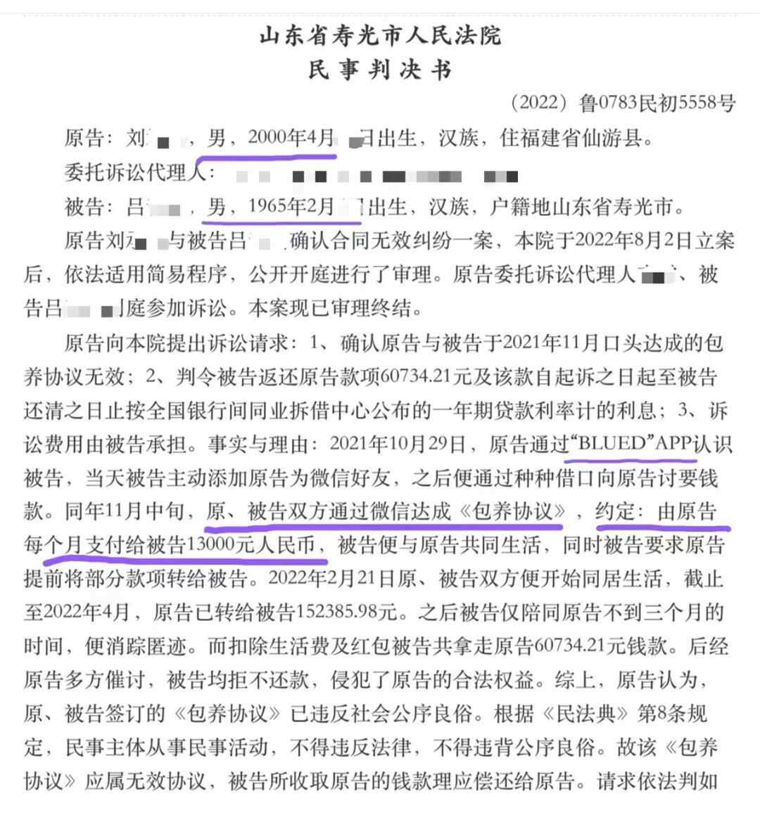 近日,一篇民事裁决文书在网上受到关注。根据该裁决文书,福建省00后男子小欧(化名)状告山东省65后主播陈某(化名),称双方之间存在“包养协议”,要求该主播退还其给予的60734.21元“包养”费用。