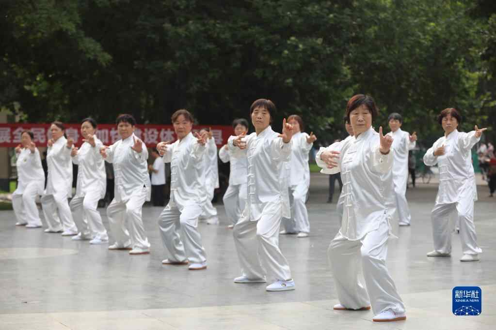 8月8日,在河南省焦作市温县太极游园,市民在全民健身日活动中表演八段锦。