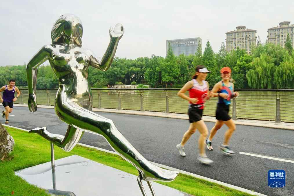 8月8日,市民在浙江省嘉兴市南湖区凌公塘文化主题公园晨跑。
