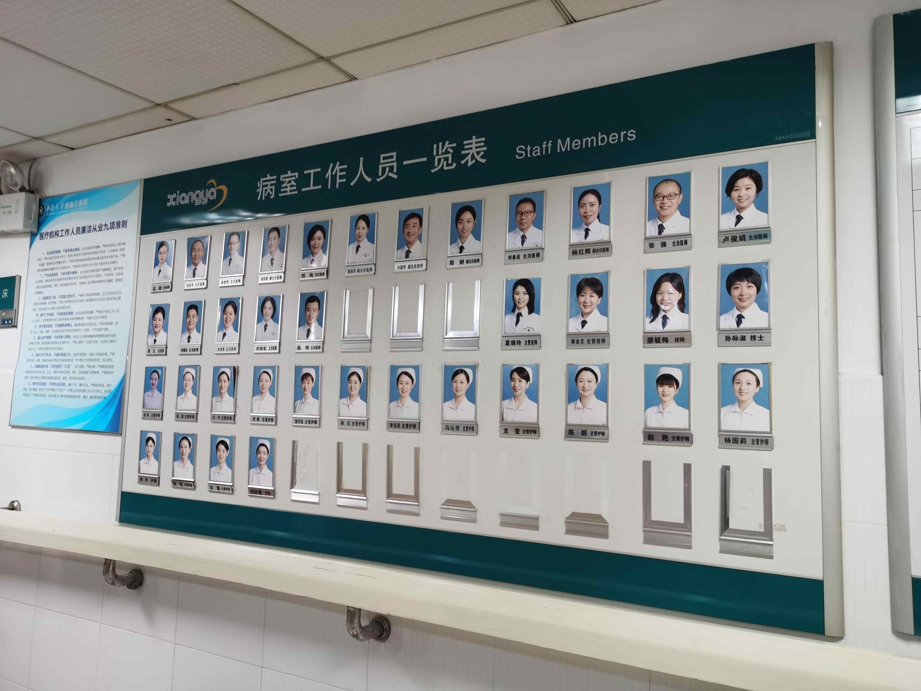 在该院的呼吸科,住院区通道的墙壁上公开了全科医护人员名单。排在第一位的头像,就是主任医师、科主任孟婕。从公布的人员看,包括医师、技师、护师在内,呼吸科共有工作人员37人。此次签名举报孟婕的9名医务人员,大多是该科室的医生。