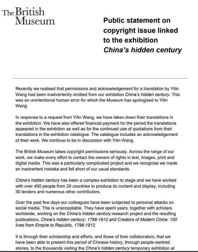 据加拿大通讯社(The Canadian Press)8日报道,大英博物馆在其官网上的一份声明中向Yilin Wang致歉,称将认真对待文化版权,并制定一项有关翻译使用许可的新政策。他们辩解称,由于没有审查翻译的政策,作为审查的一部分,他们只能“确保翻译的内容准确”,并在未来“适当地为翻译人员署名”。