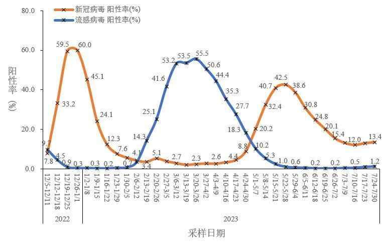 在流感样病例中,新冠病毒阳性率从5月22日至28日的42.5%开始持续下降,在7月10日至16日下降至12.0%后,开始略有上升,7月24日至30日新冠阳性率为13.4%。