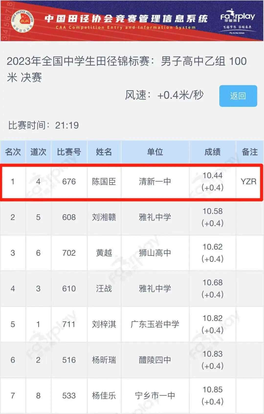 本次比赛,清新区第一中学田径队共派出6名学生,参加男子甲组100米、200米等8个项目的角逐。截至目前,已在男子乙组100米冠军、男子高中组4×100米项目取得了优异的成绩。除陈国臣获冠军外,还有三位同学达国家一级水平。