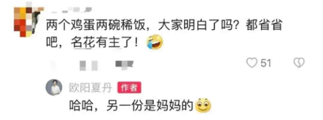 有网友说,原来主持人的背后,也是柴米油盐,不是熬稀饭,就是煮鸡蛋。另有眼尖的网友发现,她晒出的视频里有两份早餐,于是该网友猜测:欧阳夏丹已经“名花有主”。欧阳夏丹却罕见回复了网友,表示有一份是妈妈的。这条回复又被曝疑似单身。