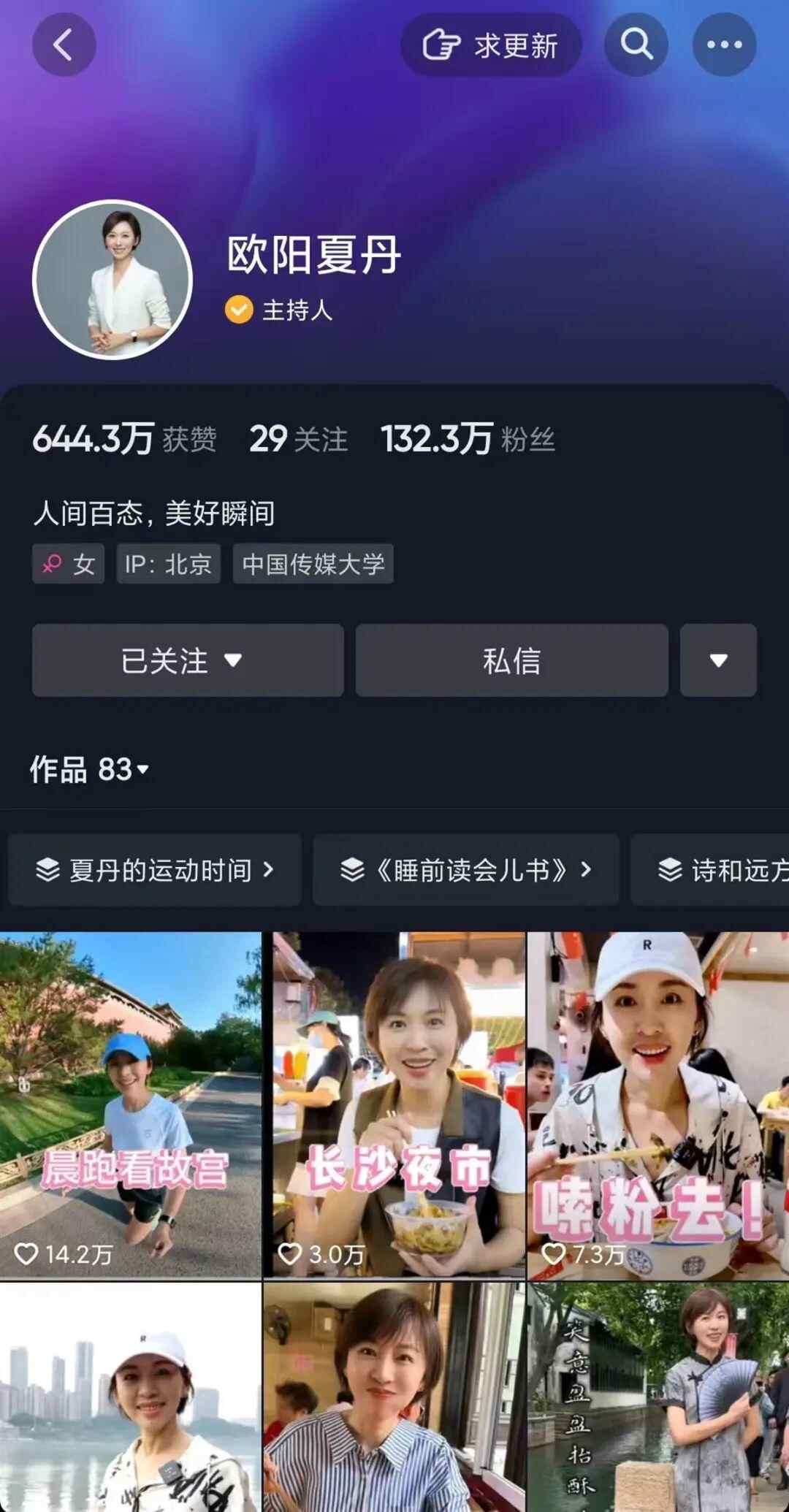 从2023年1月1日至今的半年时间里,欧阳夏丹收获了130万粉丝,她的身份认证为“主持人”。她的视频分为几个合集,包括展现自己运动跑步的“夏丹的运动时间”,讲述故事感悟的“睡前读会儿书”,和聚焦美食美景的“诗和远方”。此外,欧阳夏丹还分享过自己给艺考生上课的视频,也会分享一些演讲、朗诵、练气息、艺考等专业技巧。