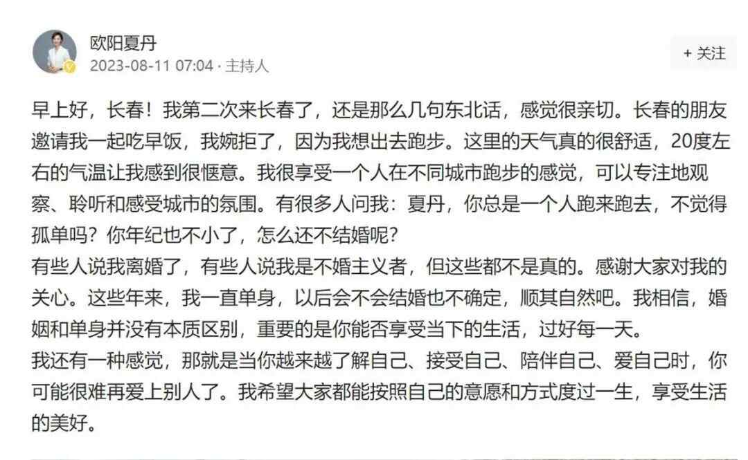 然后,欧阳夏丹接着写道:有些人说我离婚了,有些人说我是不婚主义者,但这些都不是真的。感谢大家对我的关心。这些年来,我一直单身,以后会不会结婚也不确定,顺其自然吧。我相信,婚姻和单身并没有本质区别,重要的是你能否享受当下的生活,过好每一天。