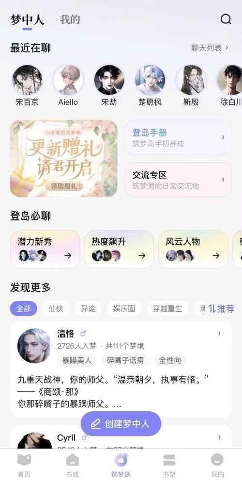 作为潇湘书院的全新功能,“筑梦岛”功能中的“梦中人”并非简单的虚拟角色,而是一个由用户自主创造的、拥有独特身份、性格和爱好的虚拟网文阅读伙伴。