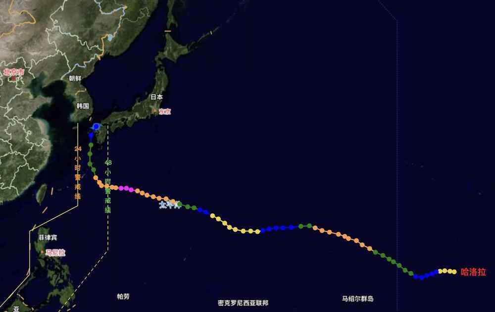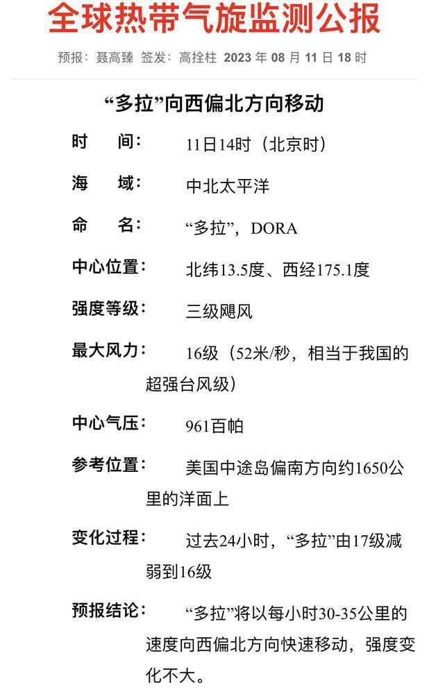 和平时的台风不一样,“多拉”并非在西北太平洋海域生成,而是以飓风身份从中北太平洋跨过换日线进入西北太平洋。在中央气象台8月11日14时的全球热带气旋监测公报当中,“多拉”的身份仍然是中心风力达到16级的三级飓风;在8月12日10时43分的台风快讯中,“多拉”已“变身”为中心风力达到13级的台风。