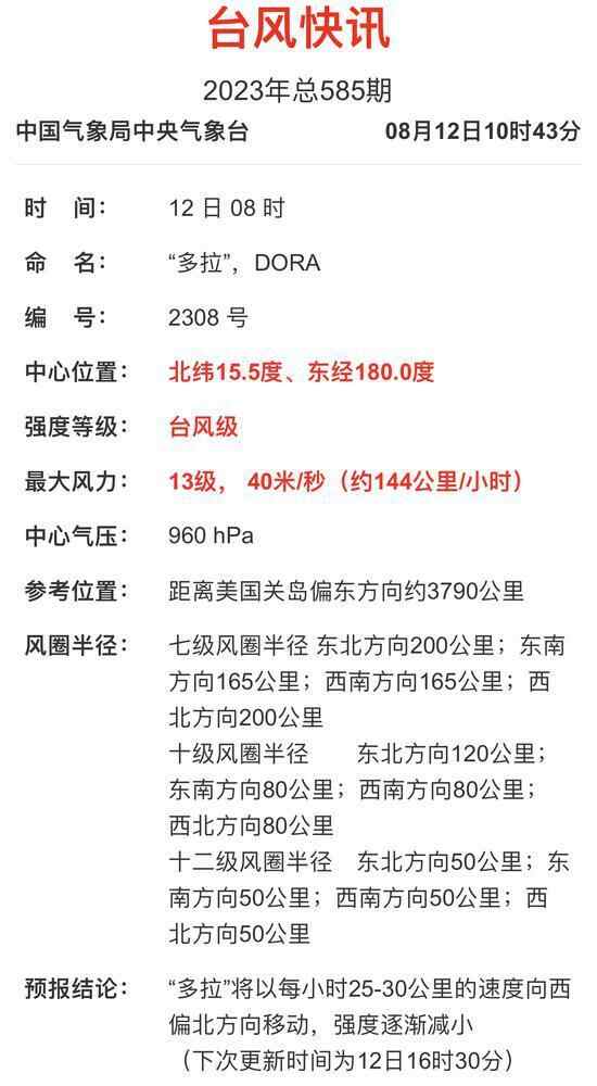 8月12日10时43分,中央气象台发布台风快讯表示,今年第8号台风“多拉”(英文名称:DORA)已被编号。