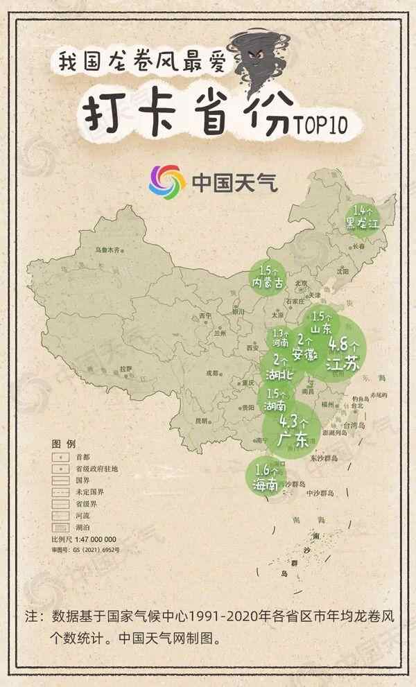 广东也是我很常打卡的省份,尤其是粤西,在这里我常和台风相伴出现。当台风在粤西登陆时,往往垂直风切变更为强烈、水汽输送充足,给我的诞生提供了有利的大气环境,这里地势平坦,也很适合我成长。另外,湖北和安徽条件也不错,每年我都会去个2次左右。