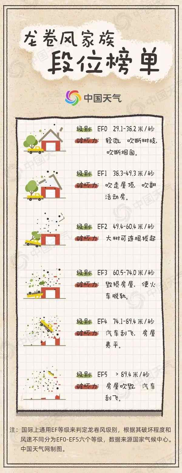 当然,我也不是每次出现都这么炸裂,我的家族里是分不同段位的。按目前国际通用的EF等级(藤田级数),我的强度从低到高分为EF0级至EF5级6个等级。EF0和EF1级最为常见,这两个虽然只是青铜段位,但已足以击碎玻璃,吹断烟囱。而EF1级就可以把房顶掀翻,造成人员伤亡了。