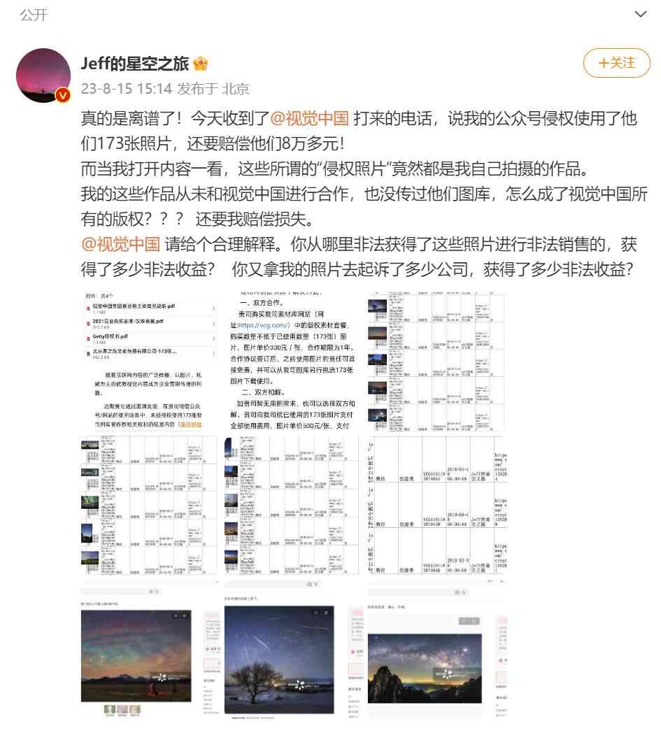 稍早前,15日下午,微博认证信息为“科学科普博主 头条文章作者”的摄影师@Jeff的星空之旅 发布消息称,“今天收到了@视觉中国 打来的电话,说我的公众号侵权使用了他们173张照片,还要赔偿他们8万多元!而当我打开内容一看,这些所谓的‘侵权照片’竟然都是我自己拍摄的作品。”