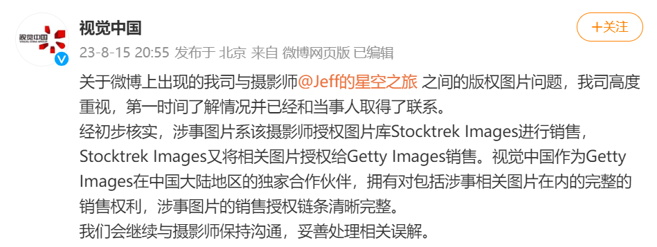 微博@视觉中国 发布消息称,“经初步核实,涉事图片系该摄影师授权图片库Stocktrek Images进行销售,Stocktrek Images又将相关图片授权给Getty Images销售。视觉中国作为Getty Images在中国大陆地区的独家合作伙伴,拥有对包括涉事相关图片在内的完整的销售权利,涉事图片的销售授权链条清晰完整。”