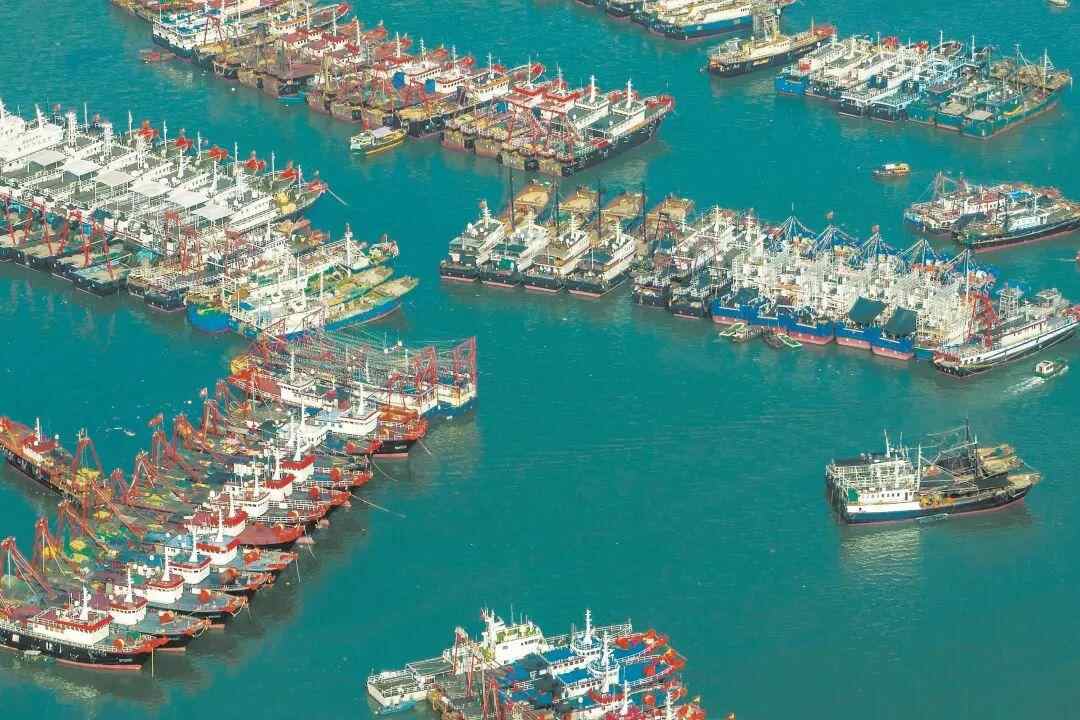 8月14日,停留在阳江闸坡渔港的渔船已修葺一新,整齐排列在港口内。图/视觉中国