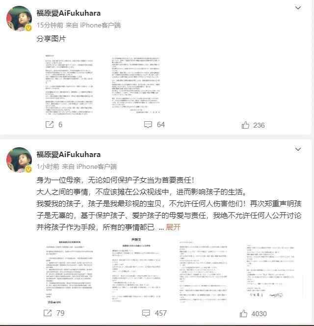 但这场记者会刚刚结束,福原爱就发布声明称,身为一位母亲,无论如何保护子女是自己的首要责任。“大人之间的事情,不应该摊在公众视线中,进而影响孩子的生活。我爱我的孩子,孩子是我最珍视的宝贝,不允许任何人伤害他们。”福原爱说,孩子是无辜的,基于保护孩子、爱护孩子的母爱与责任,“我绝不允许任何人公开讨论并将孩子作为手段,所有的事情都已诉诸司法,我会尽我最大的力量守护他们!”